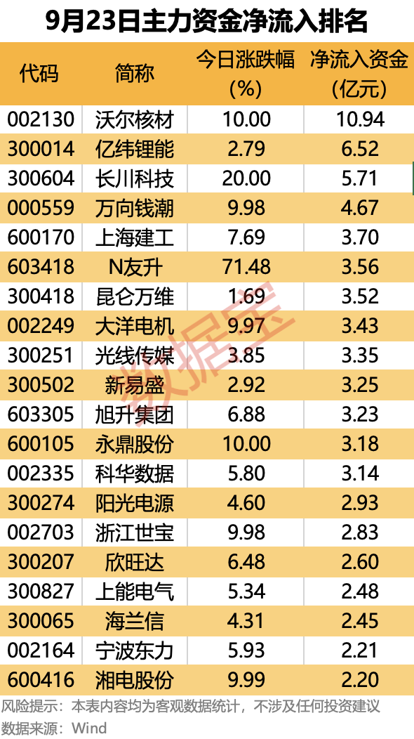 从个股来看,59股主力资金净流入均超1亿元,其中13股净流入均超3亿元。