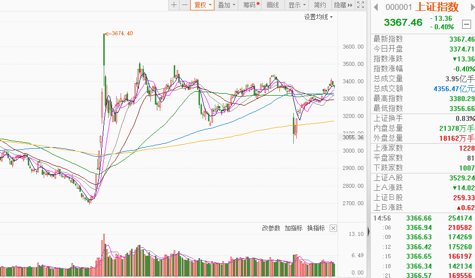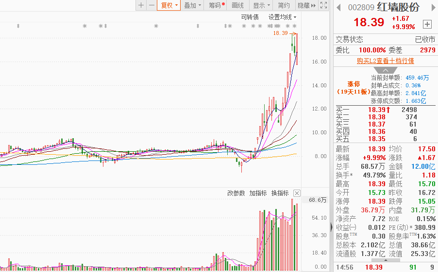 市场情绪:小盘股普遍表现活跃,与表现疲软的权重股形成了鲜明的对比。市场热点快速轮动,个股涨多跌少,全市场超3000只个股上涨。今日共56股涨停,连板股总数15只,28股封板未遂,封板率为67%(不含ST股、退市股)。焦点股方面,高位股强者恒强,化工股红墙股份19天11板、渝三峡A13天9板,军工股成飞集成8连板、利君股份8天7板。