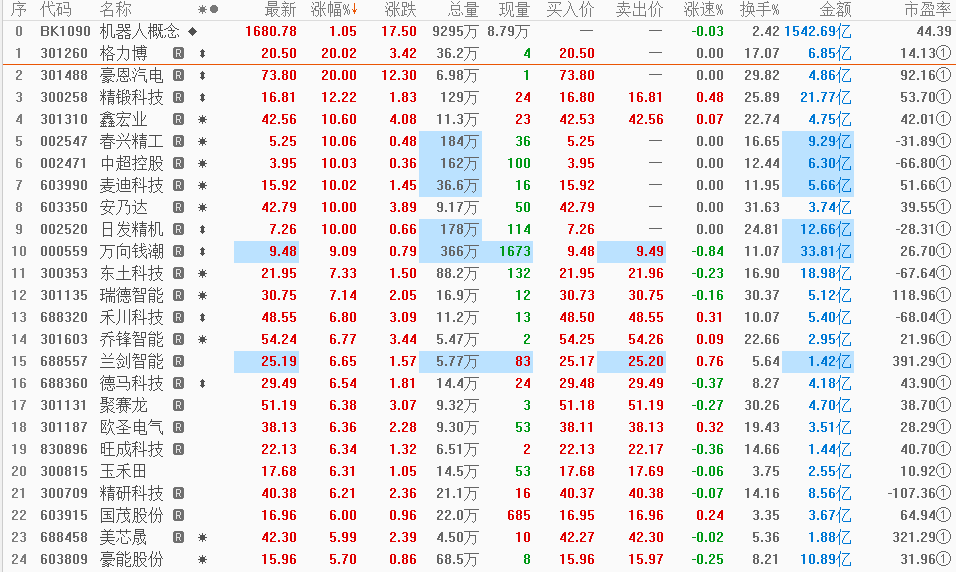 事件驱动:消息面上,马斯克预测人形机器人数量最终将达到数百亿;此外在今日的中国联通“智家通通”产品发布会上,中国联通宣布联合华为推出家庭机器人。机器人概念持续走高,万向钱潮等十余股涨停,万向钱潮走出7天4板,豪恩汽电20CM涨停,此前铭科精技、嵘泰股份、兆丰股份、新坐标等多股涨停。