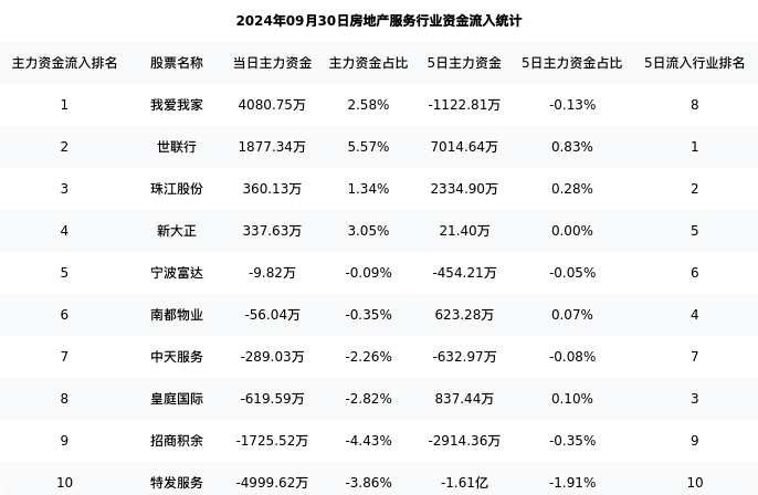 我爱我家今日净流入4080.75万,主力占比2.58%,在行业内排名:1/10;5日净流出1122.81万,主力占比0.13%,在行业内排名:8/10。
