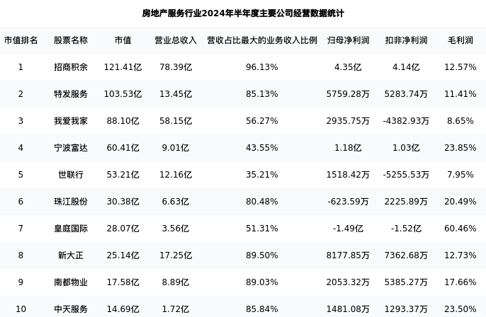 我爱我家最新报告期数据为半年度,下表汇总了房地产服务行业内市值靠前的公司半年度主要经营数据