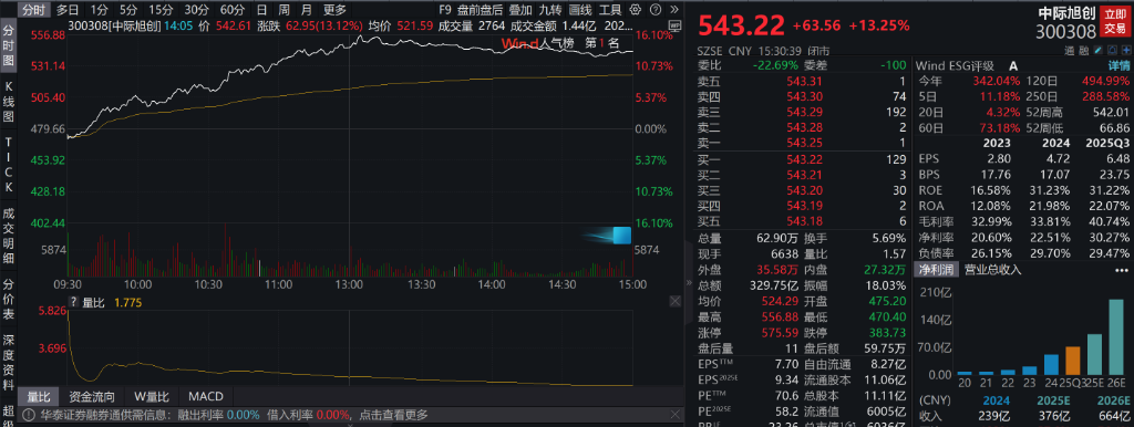 算力硬件股持续走高,中际旭创大涨超13%,股价创历史新高,总市值超6000亿元,新易盛永鼎股份光库科技天孚通信剑桥科技等多股涨超5%。