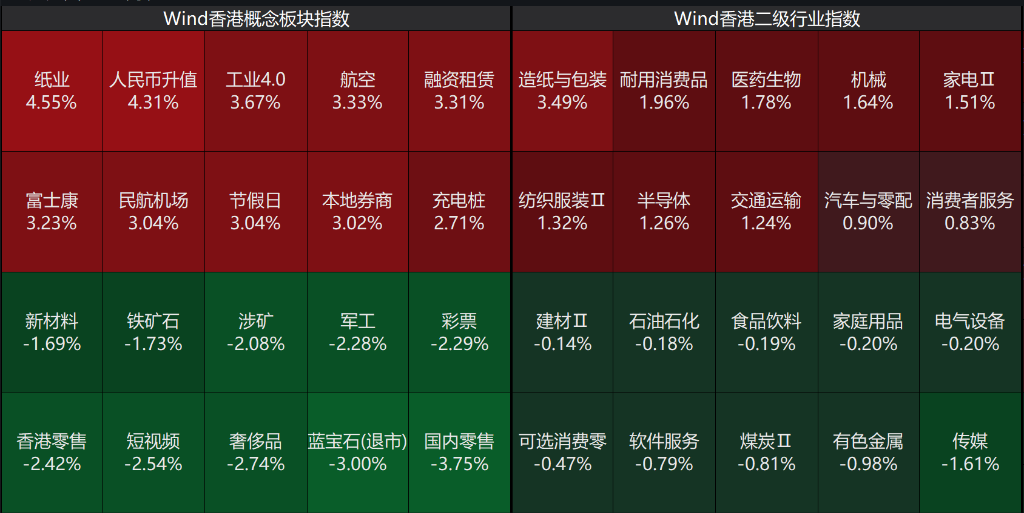 盘面上,南向资金净卖出39.52亿港元。板块方面,港股市场呈现"人民币升值主线"与"内需消费分化"格局,纸业与航空板块直接受益于汇率预期走强,工业4.0与高端制造获得资金回流。零售消费板块大幅回调反映市场对本地消费力预期转弱,军工与资源股调整显示风险偏好收敛。市场主线围绕汇率敏感型资产展开,而高估值消费与周期板块遭遇获利了结。