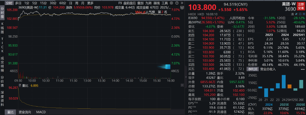 美团大涨5.65%。