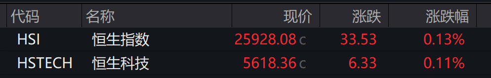 港股:截至收盘,恒生指数涨0.13%报25928.08点,恒生科技指数涨0.11%报5618.36点。