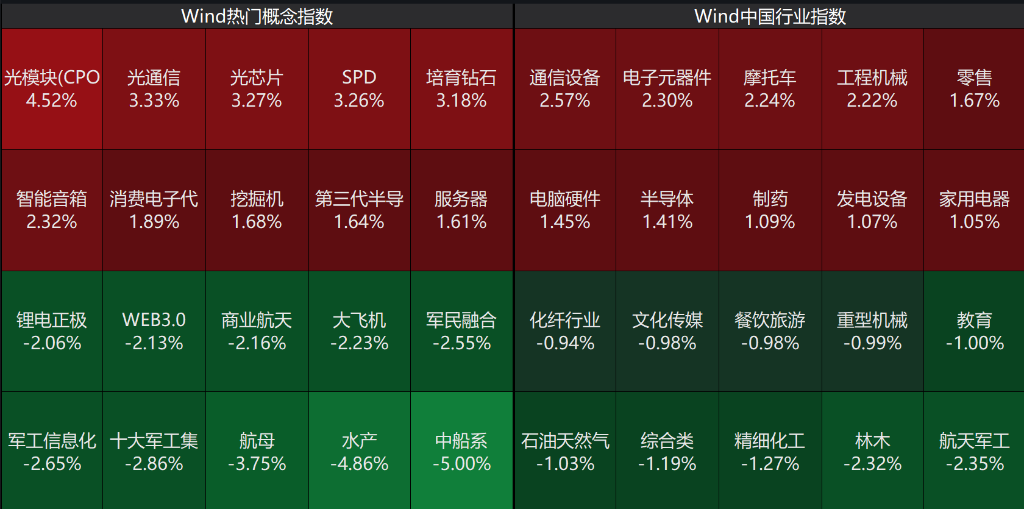 盘面上,个股跌多涨少,沪深京三市超3500股飘绿,今日成交近1.8万亿。板块方面,今日市场呈现"光电强、军工弱"的极端分化格局,光模块产业链在算力需求预期推动下获得资金集中涌入,通信与电子板块联动上涨反映科技硬件主线回归。军工板块全线回调或受短期事件情绪消退影响,水产等农业题材同步回落显示防御偏好降温。市场风格从国防安全向硬科技领域加速切换,产业趋势明确的科技制造方向成为新共识。