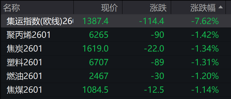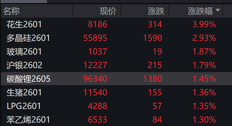 商品:花生涨3.99%,多晶硅涨2.93%,玻璃涨1.87%,沪银涨1.79%,集运指数(欧线)跌7.62%,焦炭跌1.34%,燃油跌1.20%。