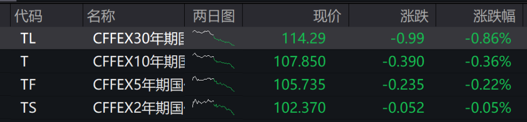 债市:30年期主力合约跌0.86%,10年期主力合约跌0.36%,5年期主力合约跌0.22%,2年期主力合约跌0.05%。