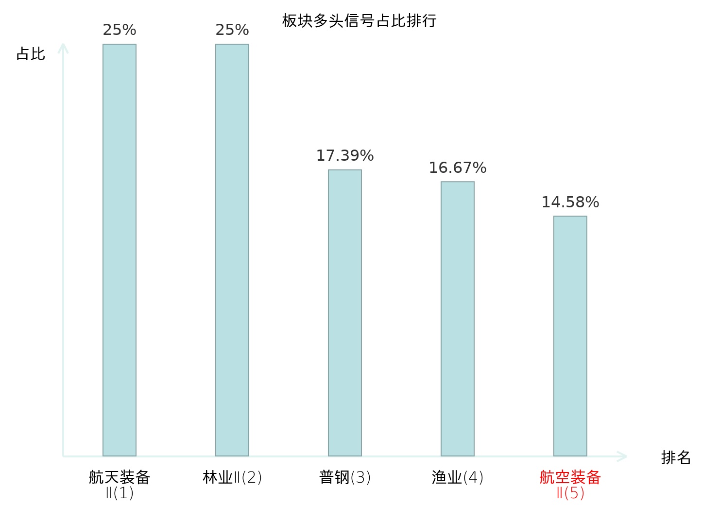 全市场所有行业板块中主力多头信号占比排名中,航天装备Ⅱ板块位居第一。林业Ⅱ板块名次提升最快,较昨日上升124位。