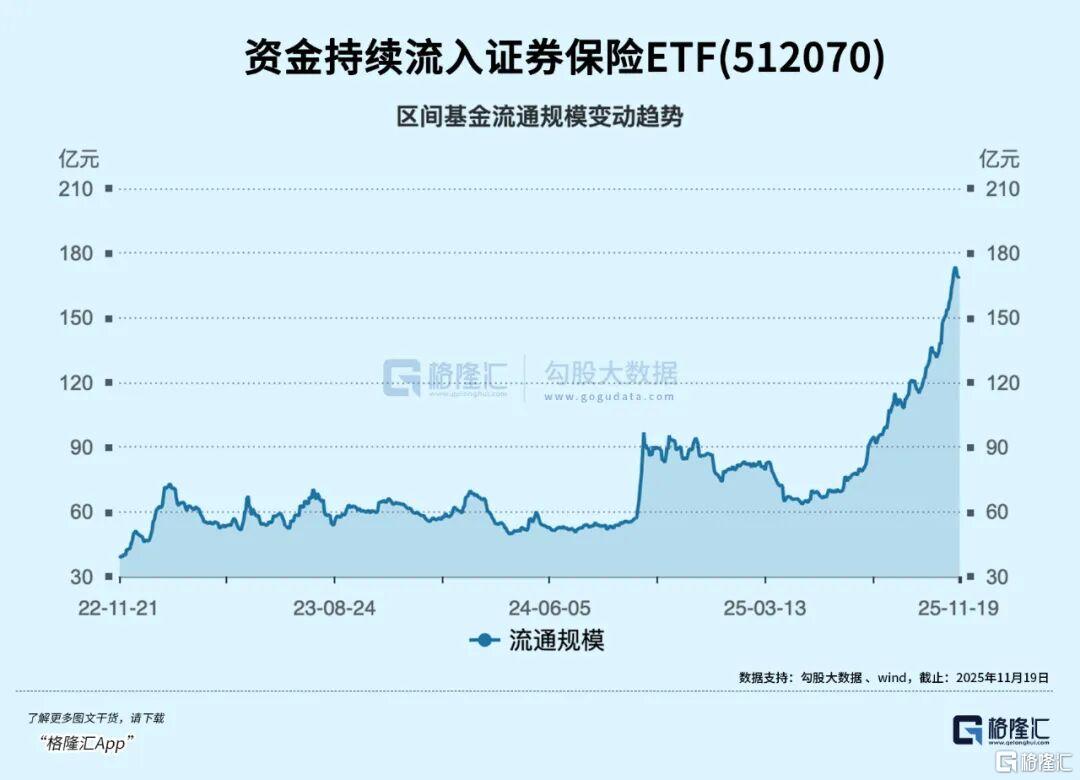 如跟踪沪深300非银行金融指数的证券保险ETF(512070),自11月以来“吸金”19.86亿元,年内资金净流入80.92亿元,最新规模169.13亿元。