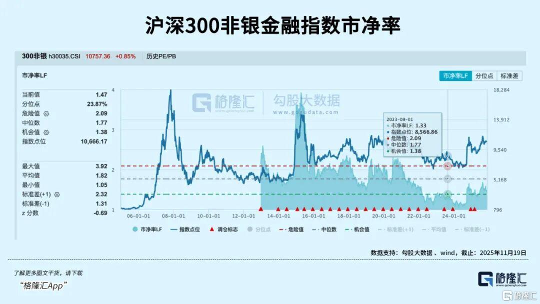 其中,沪深300非银金融指数最新市净率(LF)为1.47倍,处于23.87%的历史分位点。