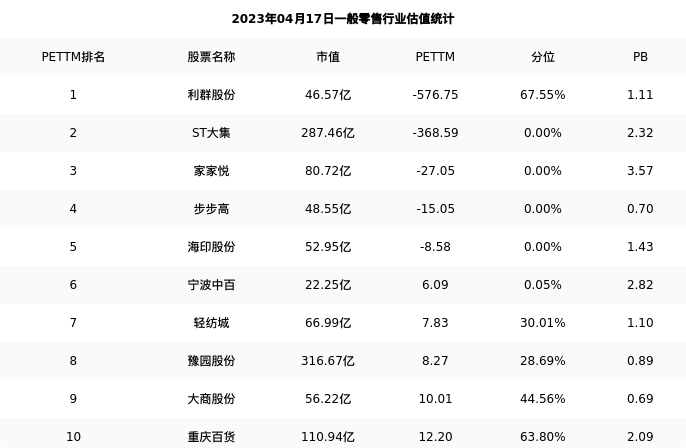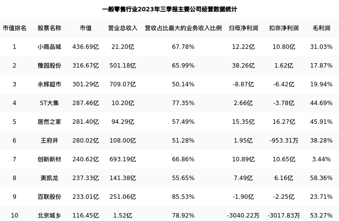 ST大集最新报告期数据为三季报,下表汇总了一般零售行业内市值靠前的公司三季报主要经营数据
