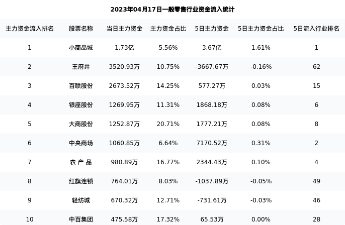 从主力资金流向来看,一般零售行业今日主力资金流入27.16亿元,在所有申万二级行业中排名:61/131。