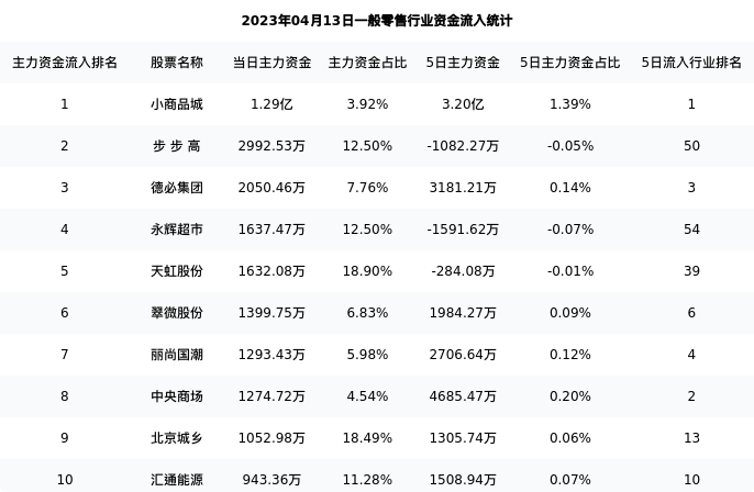 从主力资金流向来看,一般零售行业今日主力资金流入34.89亿元,在所有申万二级行业中排名:39/131。