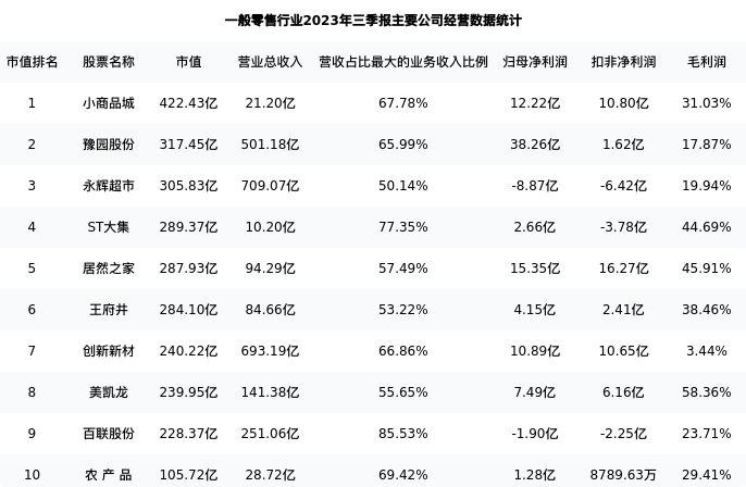 ST大集最新报告期数据为三季报,下表汇总了一般零售行业内市值靠前的公司三季报主要经营数据