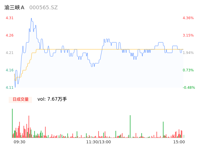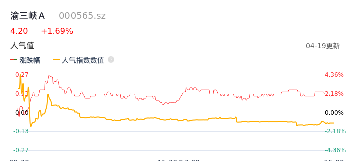 04月19日,渝三峡A收报4.20,股价涨幅1.69%,成交金额3233.44万元,换手率1.77%。