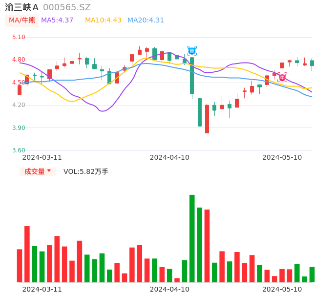 05月10日,渝三峡A收报4.72,股价涨幅-0.63%,成交金额2749.79万元,换手率1.34%。