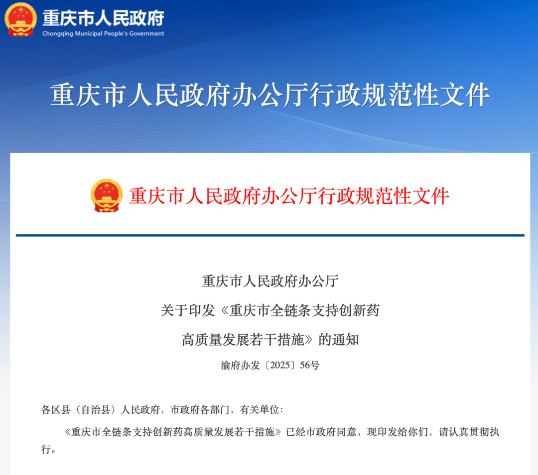 《若干措施》还提到,加大金融支持力度。争取国家新型政策性金融工具支持,鼓励金融机构采取中长期授信、知识产权质押、银担银租联动等方式支持企业开发创新药。采取银行贷款贴息、融资租赁贴息、担保补助等方式支持企业进行技术改造。重庆市产业投资母基金等发挥耐心资本作用,带动引导更多社会资本加大对创新药投资力度。探索以“企业+国有资本+社会资本”的模式组建专项基金,支持大型企业前瞻布局技术体系和产品管线。完善中小企业投融资服务机制。建立梯度化发债企业名单制,支持生物医药企业开展债券融资。加强上市辅导培育,推动生物医药企业在境内外资本市场上市。