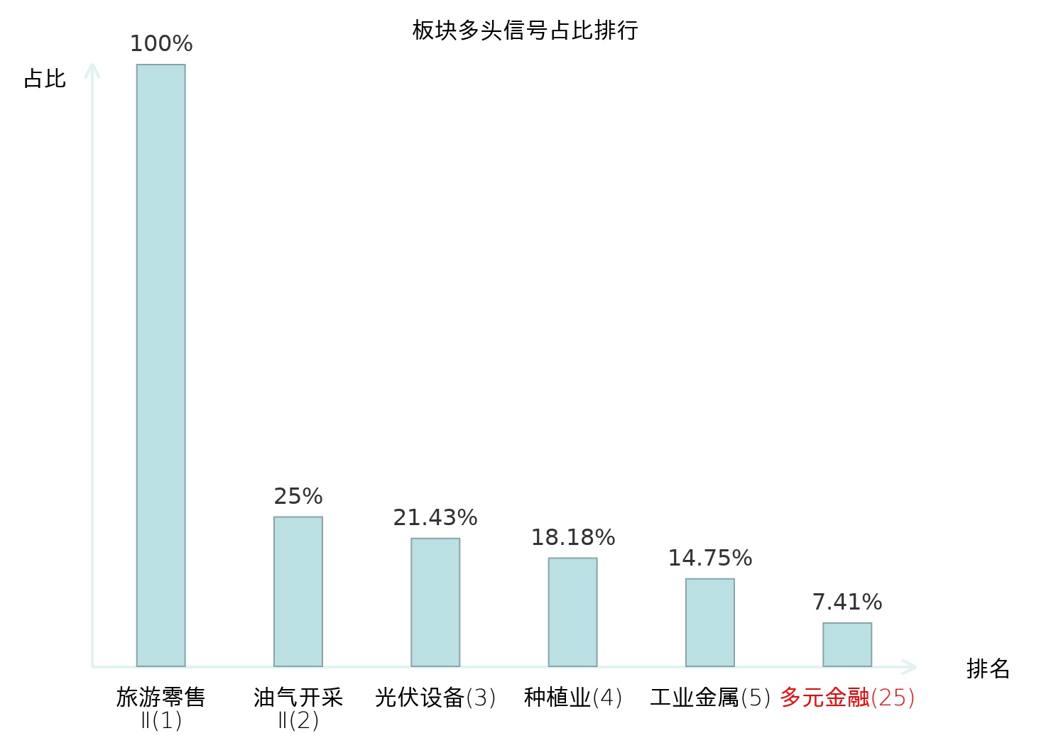 全市场所有行业板块中主力多头信号占比排名中,旅游零售Ⅱ板块位居第一。旅游零售Ⅱ板块名次提升最快,较昨日上升130位。