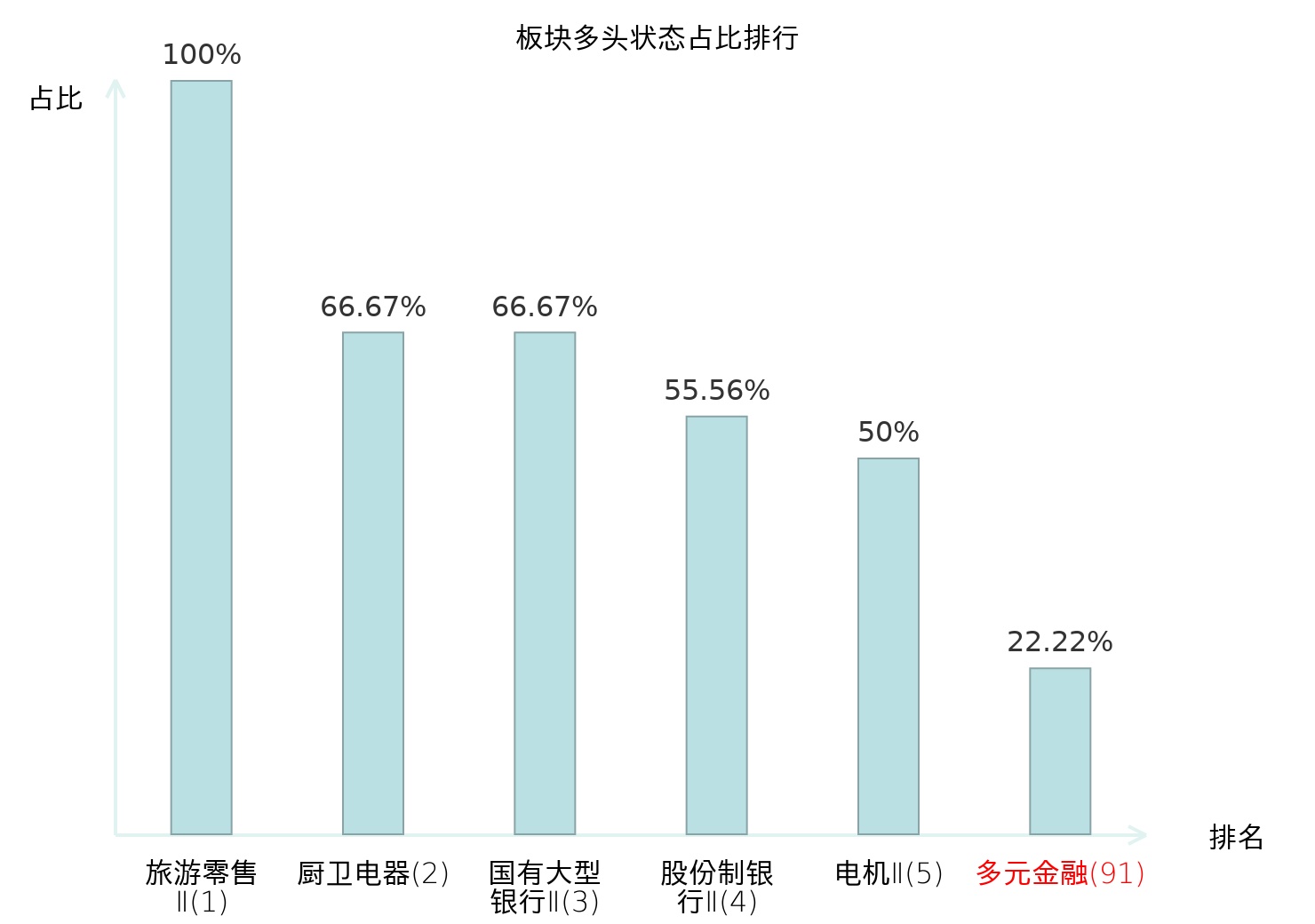 全市场所有行业板块中主力多头状态占比排名中,旅游零售Ⅱ板块位居第一。水泥板块名次提升最快,较昨日上升80位。