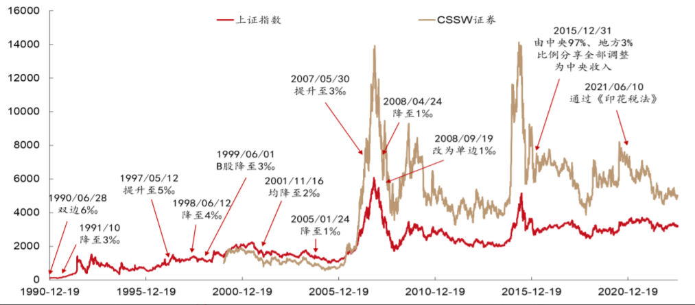 历史6次调降,券商板块具备显著超额收益。回顾历史,1990年以来,我国印花税经历9次调整,其中6次为调降、3次为调增。从调降后市场主要指数表现来看,大盘指数多有明显上行,表明印花税下降对市场情绪提振效果明显。