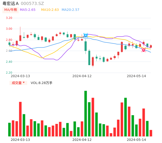 05月14日,粤宏远A收报2.70,股价涨幅1.12%,成交金额2230.68万元,换手率1.31%。
