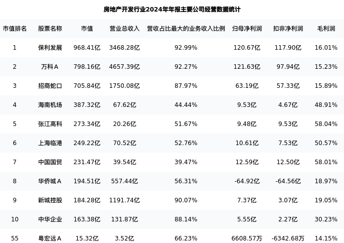 粤宏远A最新报告期数据为年报,下表汇总了房地产开发行业内市值靠前的公司年报主要经营数据