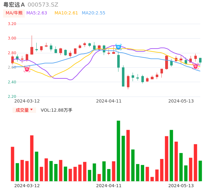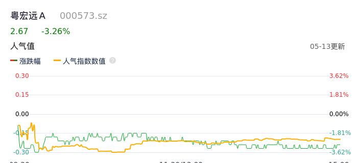 05月13日,粤宏远A收报2.67,股价涨幅-3.26%,成交金额3451.79万元,换手率2.03%。