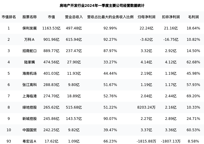 粤宏远A最新报告期数据为一季度,下表汇总了房地产开发行业内市值靠前的公司一季度主要经营数据