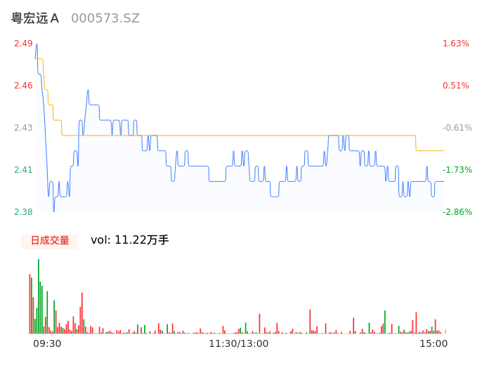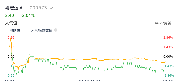 04月22日,粤宏远A收报2.40,股价涨幅-2.04%,成交金额2720.18万元,换手率1.77%。