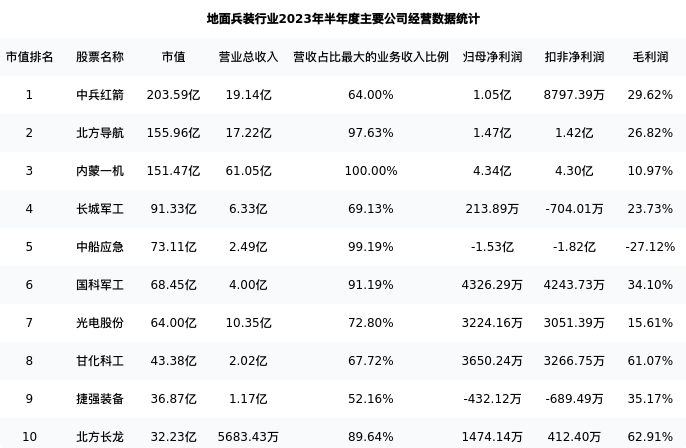 甘化科工最新报告期数据为半年度,下表汇总了地面兵装行业内市值靠前的公司半年度主要经营数据