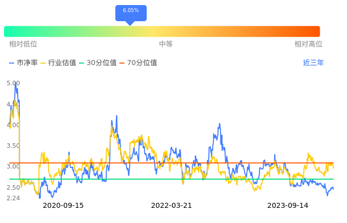甘化科工当前市净率PB为2.46,在所属的地面兵装中,市净率PB排4,前五名分别为内蒙一机市净率1.40、银河电子市净率2.01、中兵红箭市净率2.17、甘化科工市净率2.46、光电股份市净率2.64。甘化科工当前市净率PB为2.45,超过近3年6.05%的历史数据。
