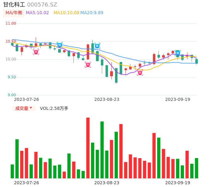 09月19日,甘化科工收报9.88,股价涨幅-1.59%,成交金额2559.38万元,换手率0.60%。