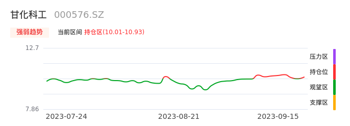 我们来看一下该股的九方特色指标强弱趋势的情况:甘化科工近日从观望区上穿到持仓区。股价短期站稳多头区域,上升动能仍较为充足,可积极关注。后续重点关注上方压力位:10.93元是否能突破上攻。