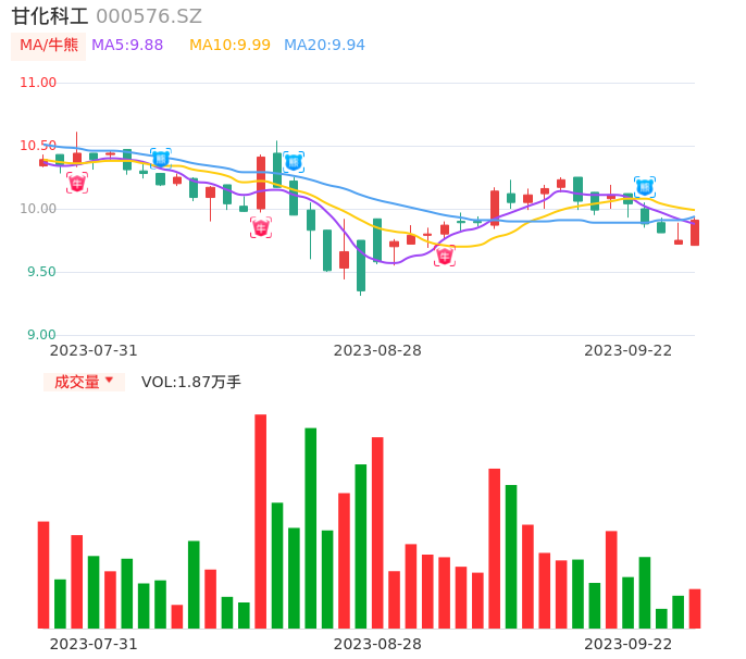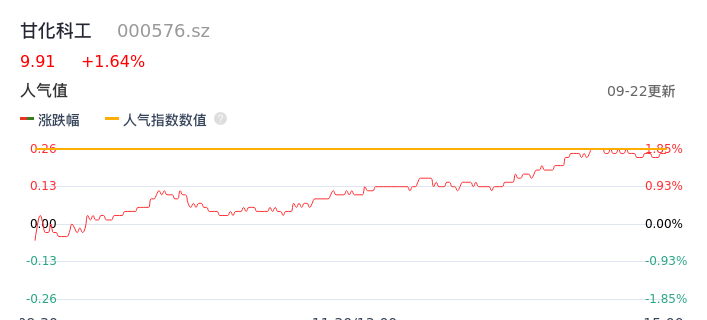 09月22日,甘化科工收报9.91,股价涨幅1.64%,成交金额1842.36万元,换手率0.44%。