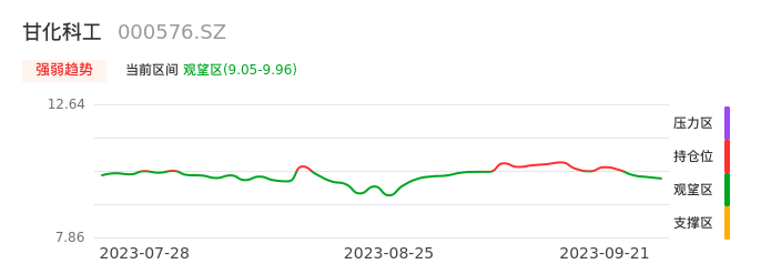 我们来看一下该股的九方特色指标强弱趋势的情况:甘化科工近日从持仓区下穿到观望区,股价出现持续性调整行情。短期已经转为空头行情,且下跌动能仍未衰竭。建议继续谨慎观望。