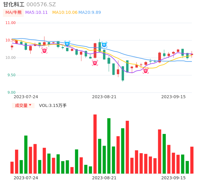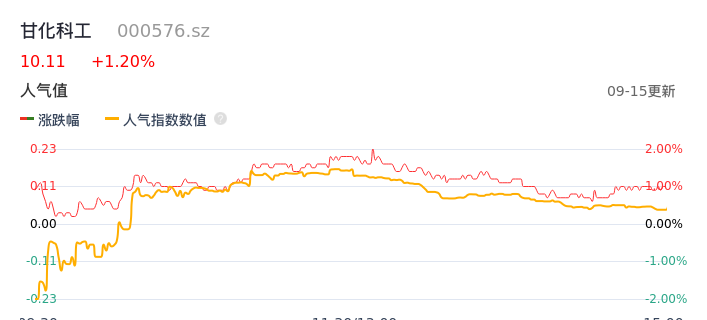 09月15日,甘化科工收报10.11,股价涨幅1.20%,成交金额3184.14万元,换手率0.73%。