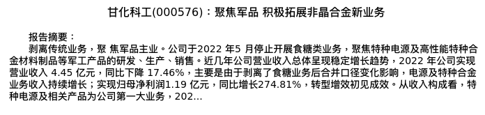 值得注意的是:2023年09月东北证券的王凤华/王璐分析师,首次发布关于甘化科工的研究报告,标题为:甘化科工(000576):聚焦军品 积极拓展非晶合金新业务。
