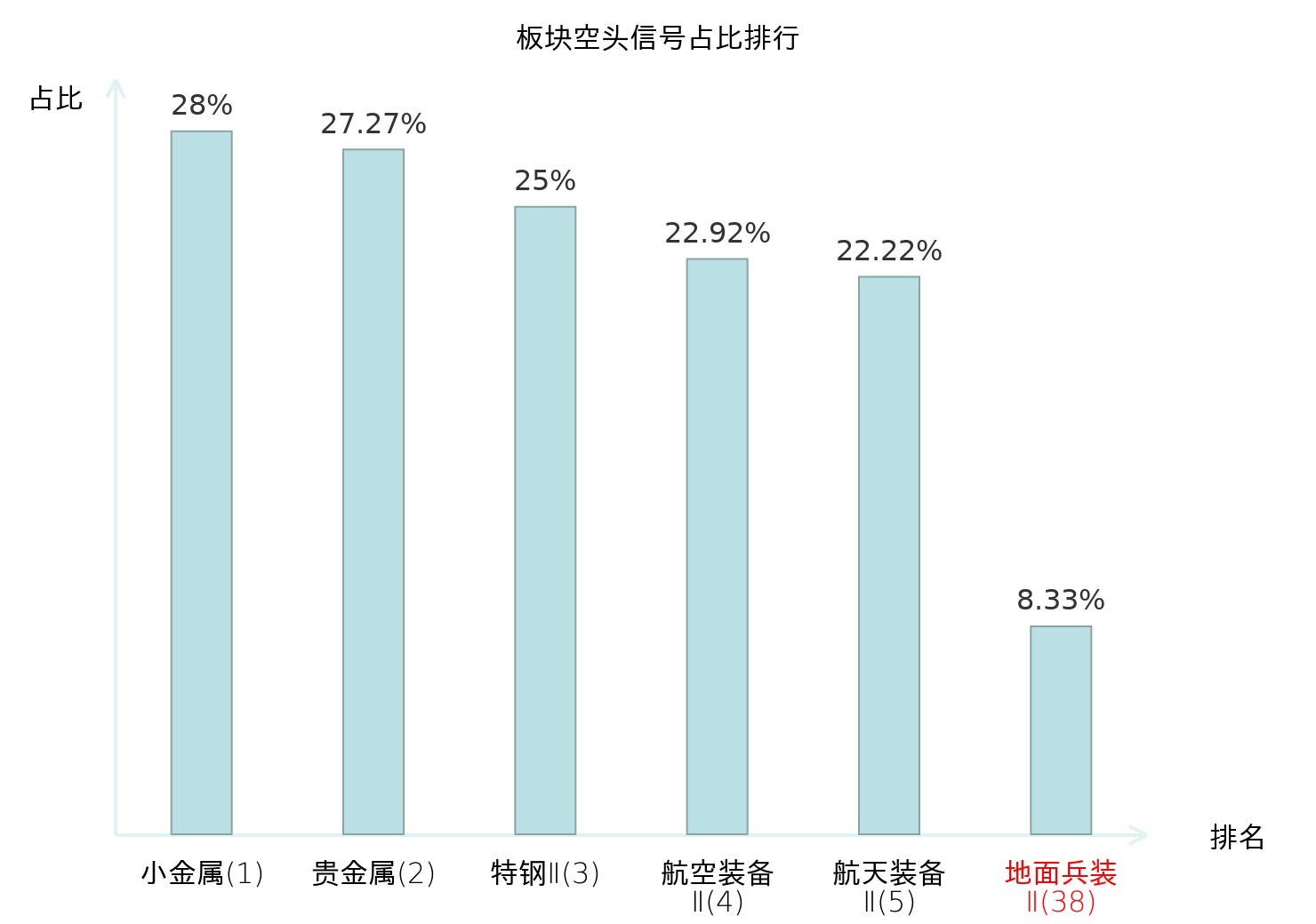 全市场所有行业板块中主力空头信号占比排名中,小金属板块位居第一。铁路公路板块名次提升最快,较昨日上升113位。