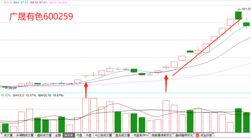 如图是广晟有色2010年9月份k线走势图,该股算是这段时间的第一牛股了。两个箭头处分别指的是2010年9月9日和2010年9月28日的走势,换手较之前都明显放大;第二日走势均是迅速拉高,不低收或涨停收盘,随后股价一路飞升。
