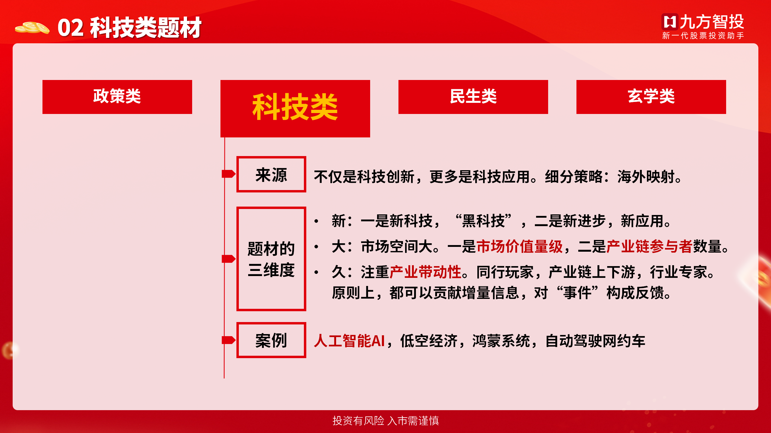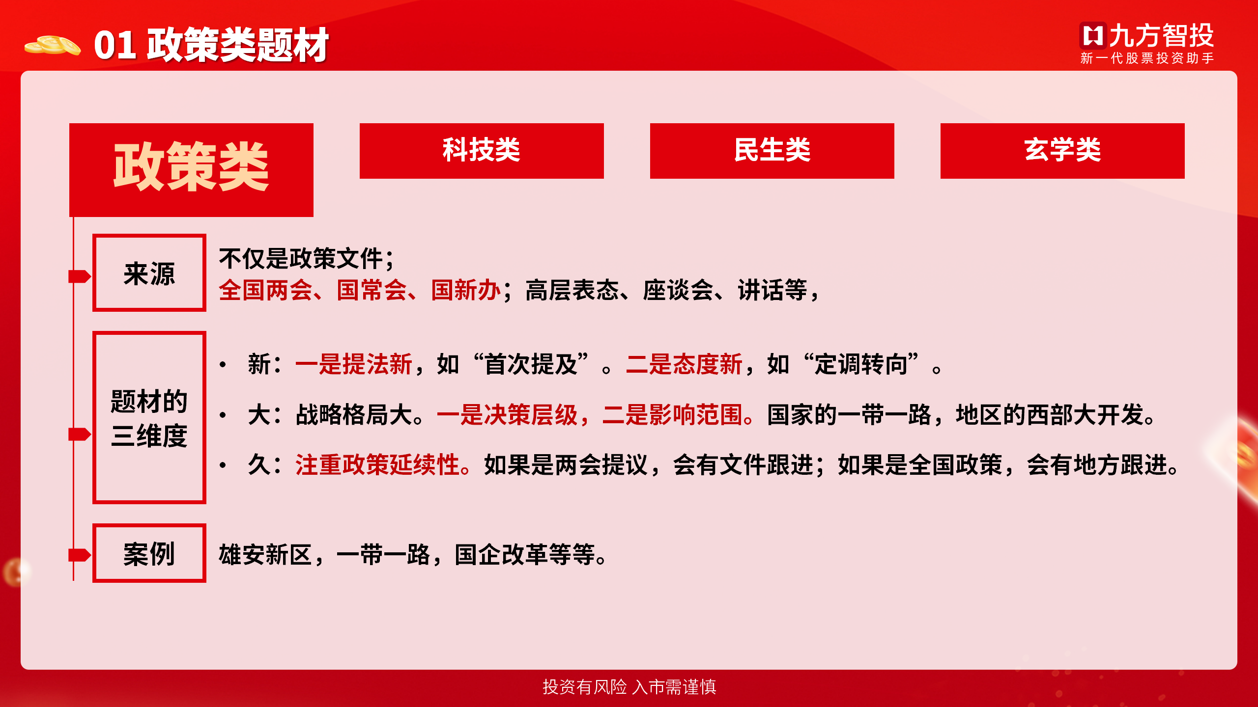 可以说,科技类题材与政策类题材,是题材投资中两大平分秋色的板块,这两个方向上面值得大家尤为关注。