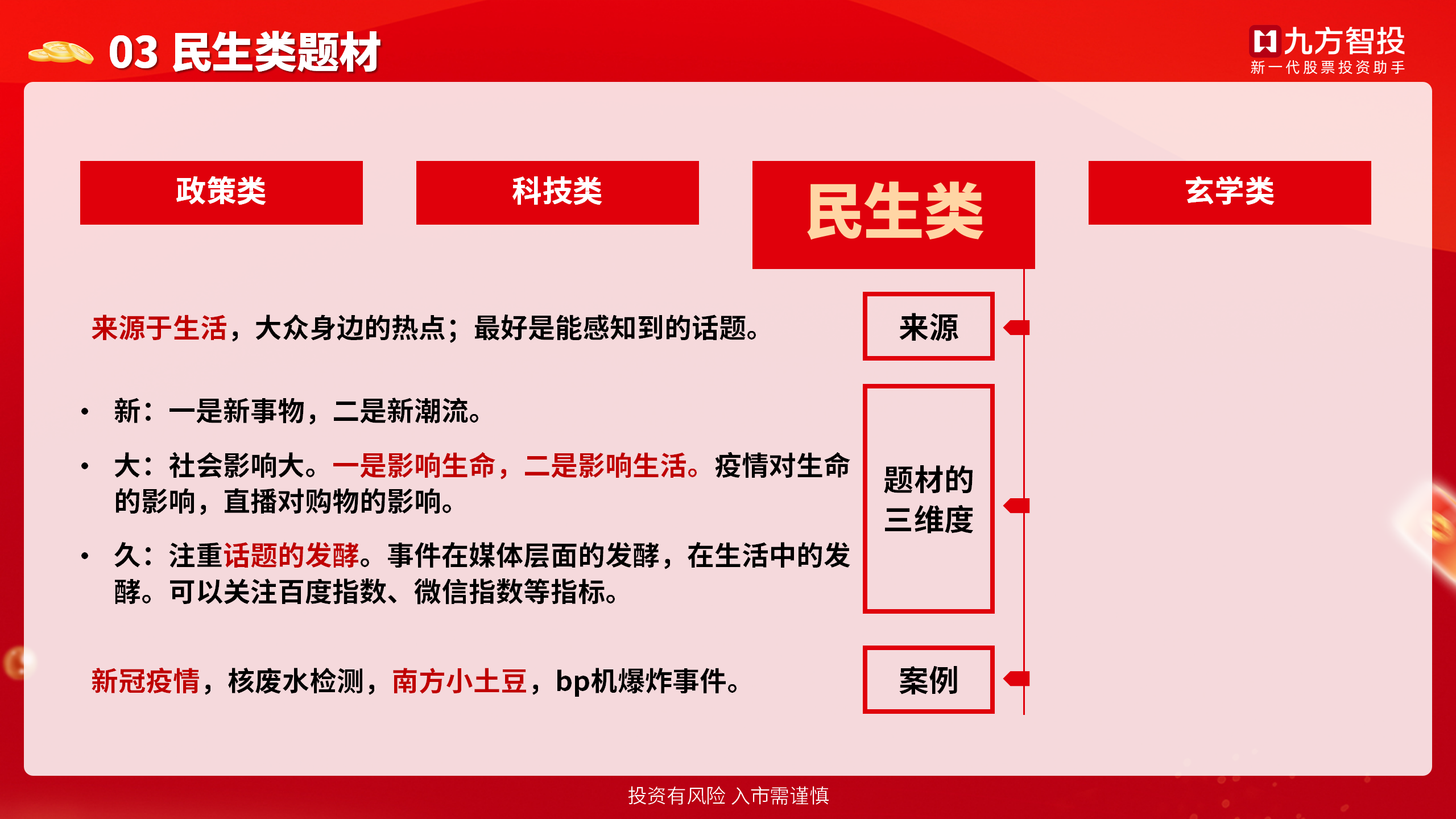 比如,有一类题材是先在大众这个群体当中传播,进而传播到投资者群体。这在某种程度上,就是迎合我们民生类题材的特征。