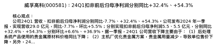 值得注意的是:2024年04月广发证券的张乐/邓崇静/周伟分析师,首次发布关于威孚高科的研究报告,标题为:威孚高科(000581):24Q1扣非前后归母净利润分别同比+32.4%、+54.3%。