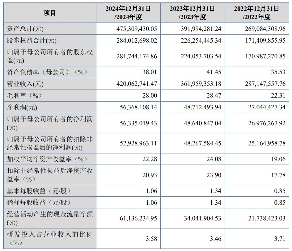 财务方面,于2022年度、2023年度、2024年度,公司实现营业收入分别约为2.87亿元、3.62亿元、4.20亿元,同期实现净利润分别约为2704.44万元、4871.25万元、5636.81万人民币。