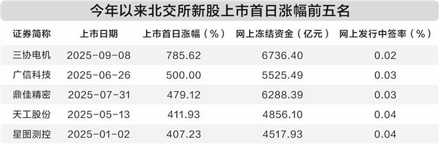 打新资金激增直接导致中签率持续走低。8月22日上市的能之光吸引了70.48万户投资者参与打新,冻结资金5645.43亿元,最终8.3万户获配,中签率仅0.0179%,为北交所历史最低;此外,三协电机中签率为0.0224%,鼎佳精密、广信科技、交大铁发等中签率约为0.03%。