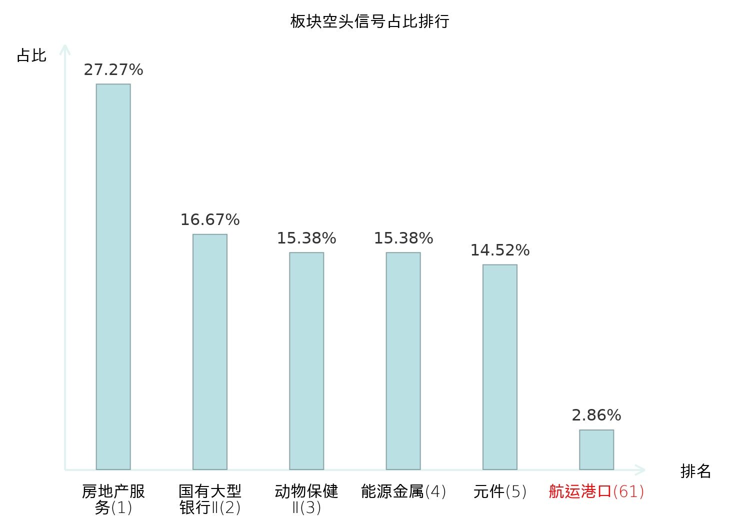 全市场所有行业板块中主力空头信号占比排名中,房地产服务板块位居第一。元件板块名次提升最快,较昨日上升122位。