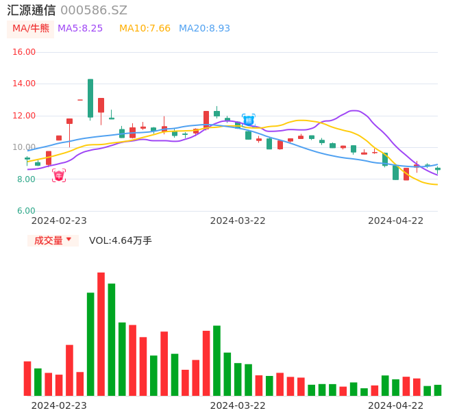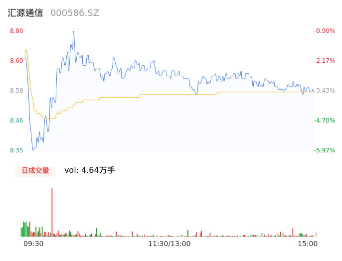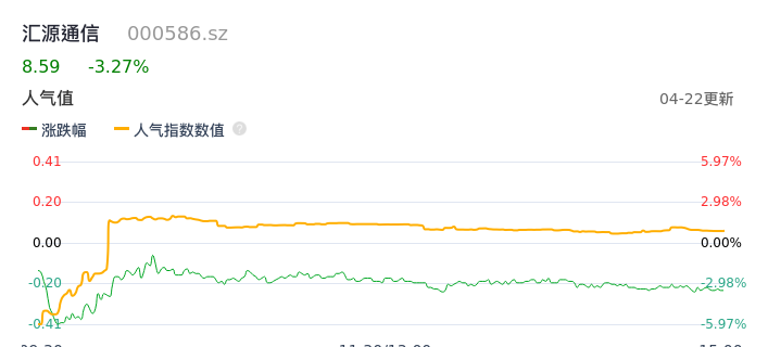 04月22日,汇源通信收报8.59,股价涨幅-3.27%,成交金额3976.13万元,换手率2.40%。