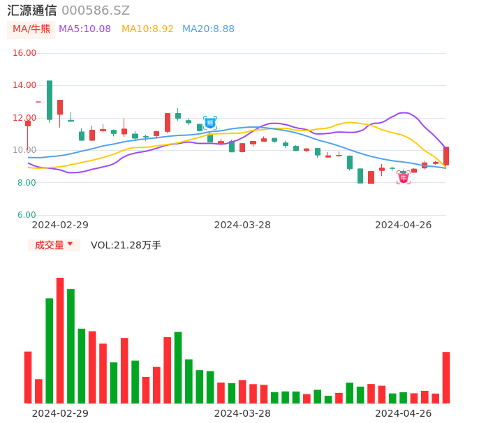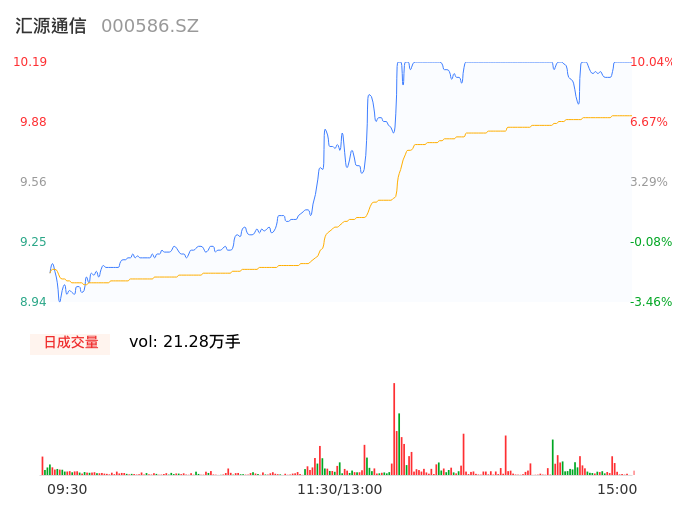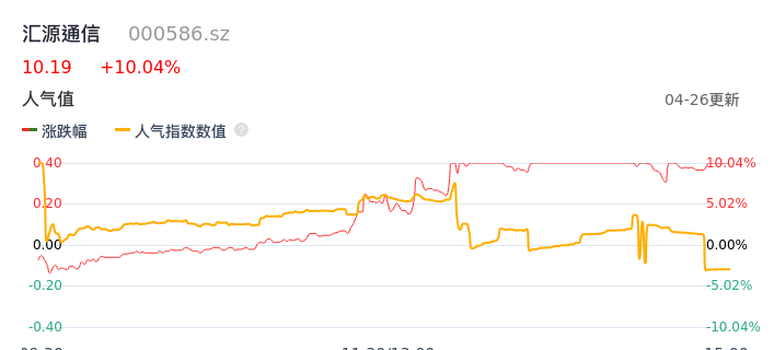 04月26日,汇源通信收报10.19,股价涨幅10.04%,成交金额2.11亿元,换手率11.00%。