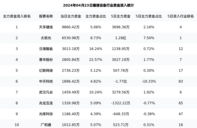 下表为今日行业内流入前10股票的信息