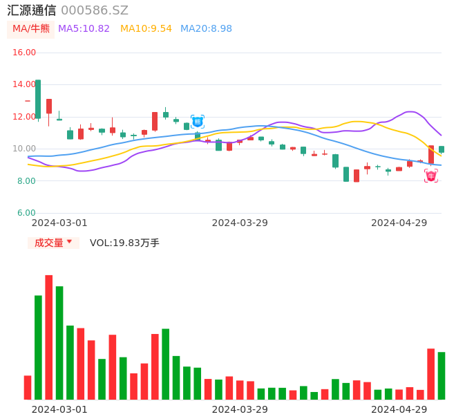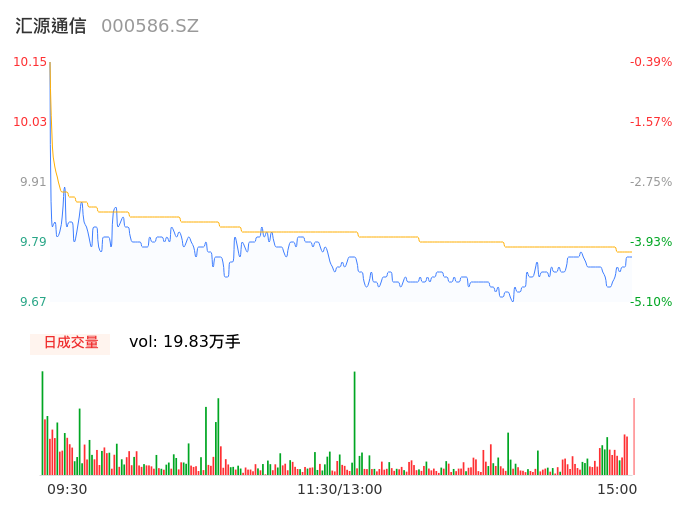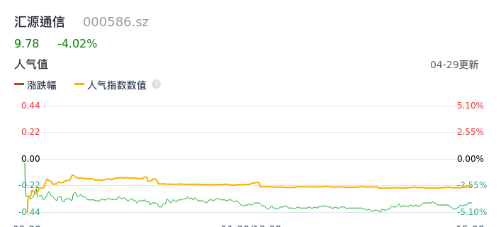 04月29日,汇源通信收报9.78,股价涨幅-4.02%,成交金额1.94亿元,换手率10.25%。